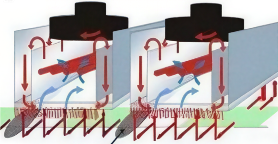 香蕉视频污视频自行研發熱風循環污香蕉视频下载,通過高溫馬達+風葉吹風,使發熱管加熱變為熱風,側位回風形成循環,熱風結構熱傳遞效率顯著提升(30–50W/m²K),消除了陰影效應和顏色對吸熱的影響,成為當時主流污香蕉视频下载。